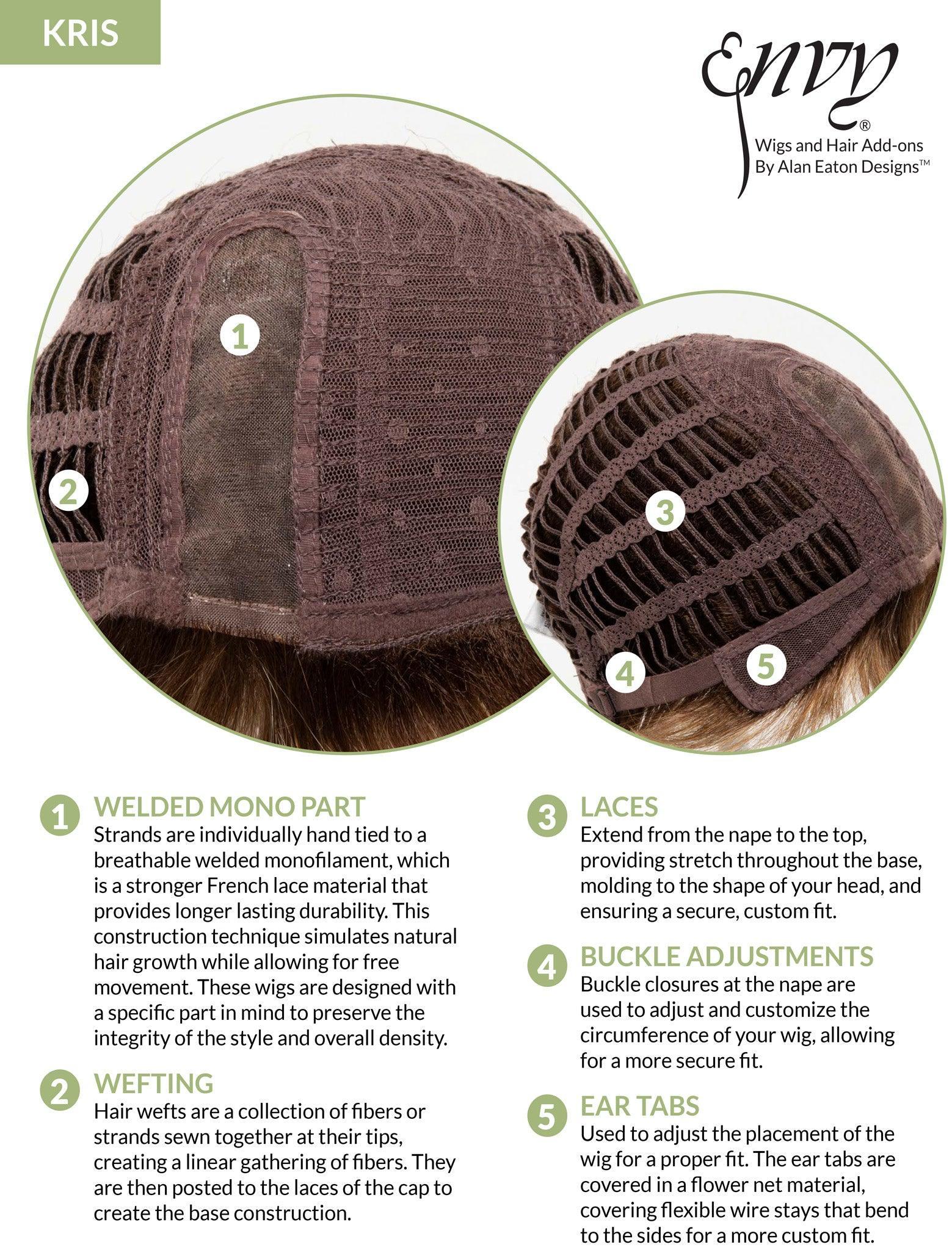 With long, side-swept bangs offering a flirty retro feel, KRIS by ENVY is chic pixie styling at its best. The Hand Tied Mono Part construction simulates natural hair growth for ease of styling the novice wig wearer will love. While the choice of 25 vibrant multi-dimensional colorations ensure women of every age can find the one they love.
