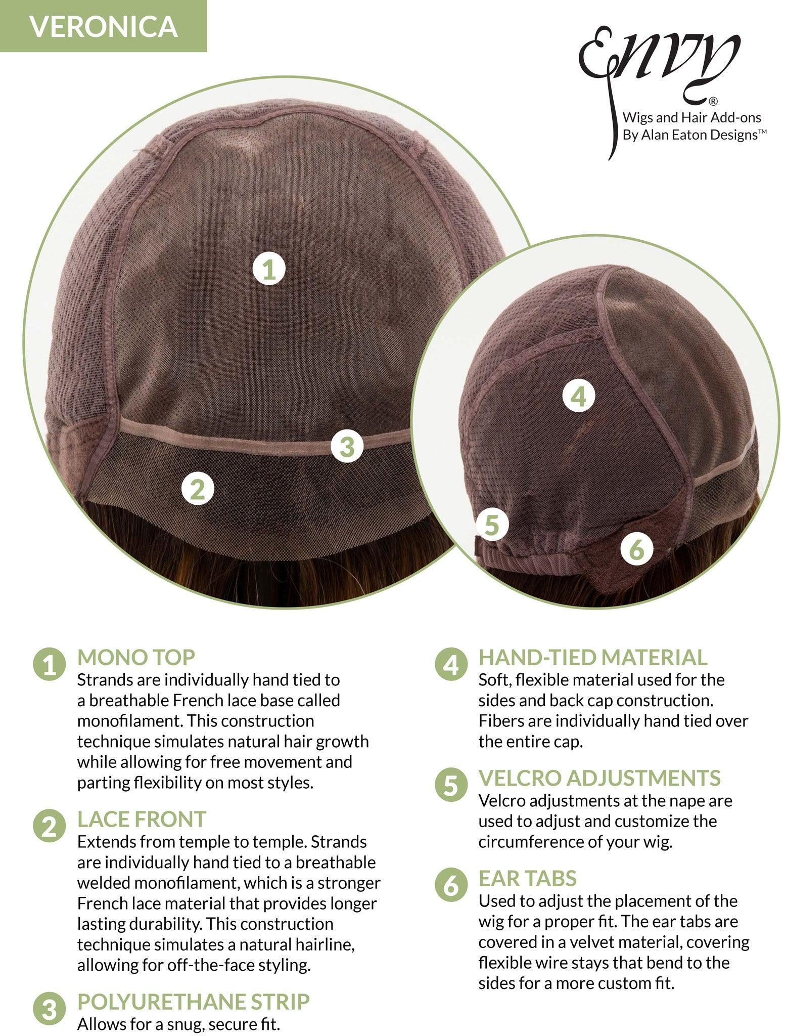 Looking for the drama and stylability of a longer wig? VERONICA features our exclusive EnvyHair™ heat-friendly blend which offers the versatility of human hair products—but at a fraction of the price. And its Mono Top construction and Hand-Tied sides and back provide an authenticity and stylability that is truly enviable.